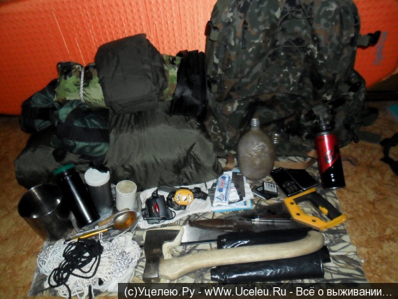 Да баллон газа на нём резак.Далее смартфон НТС, мобильник СониЭрикссон к790 +запасное питание.Медикаменты.Фонарик.Сковородка.Ложки, вилки.Кружка 1л.Чай, сахар, соль.За ними спальник с компрессионником.Палатка и плащ-палатка.Сумочка с мыльно-рыльным.