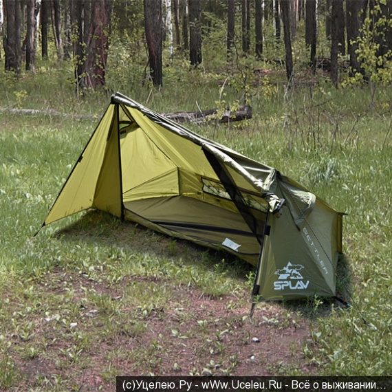 Палатка Сеттлер от Сплава.Лёгкая однослойка.950г вес.Как любая одноместка, хлопотная для проживания даже мне, а тебе не знаю.Суди сам.Это же переночевал и дальше.Не кемпинговая.