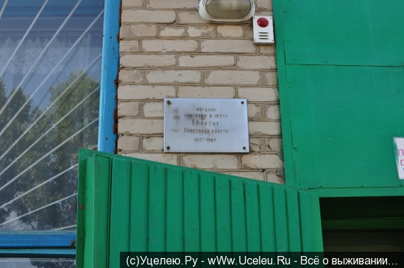 Надпись — «Магазин построен в честь 50-и летия советской власти»