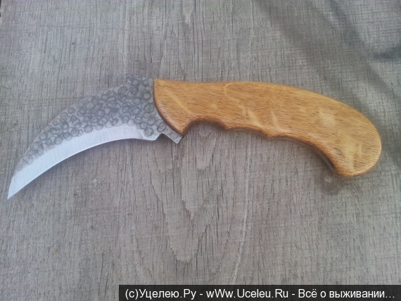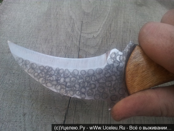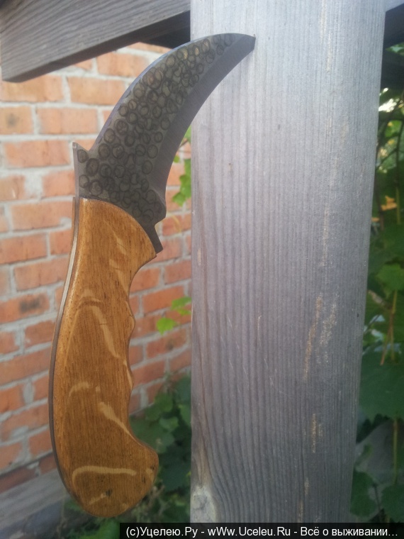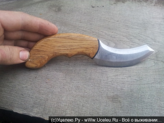 Правда, я чуть-чуть увеличил угол кончика, чтобы он стал нецеплючим. И ручка мне хотя и понравилась – я начал эксперементировать. Уже готовое лезвие я обмазал пластилином и долго подгонял рукоять под себя. И пришел почти к тому же, что и на снимке. Загиб и расширение к концу позволяет размашисто рубить, не боясь, что вылетит из рук – при этом нож беру подальше от лезвия – все пальцы находятся за псевдогардой.